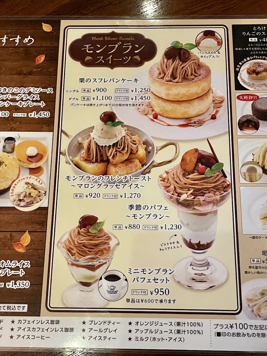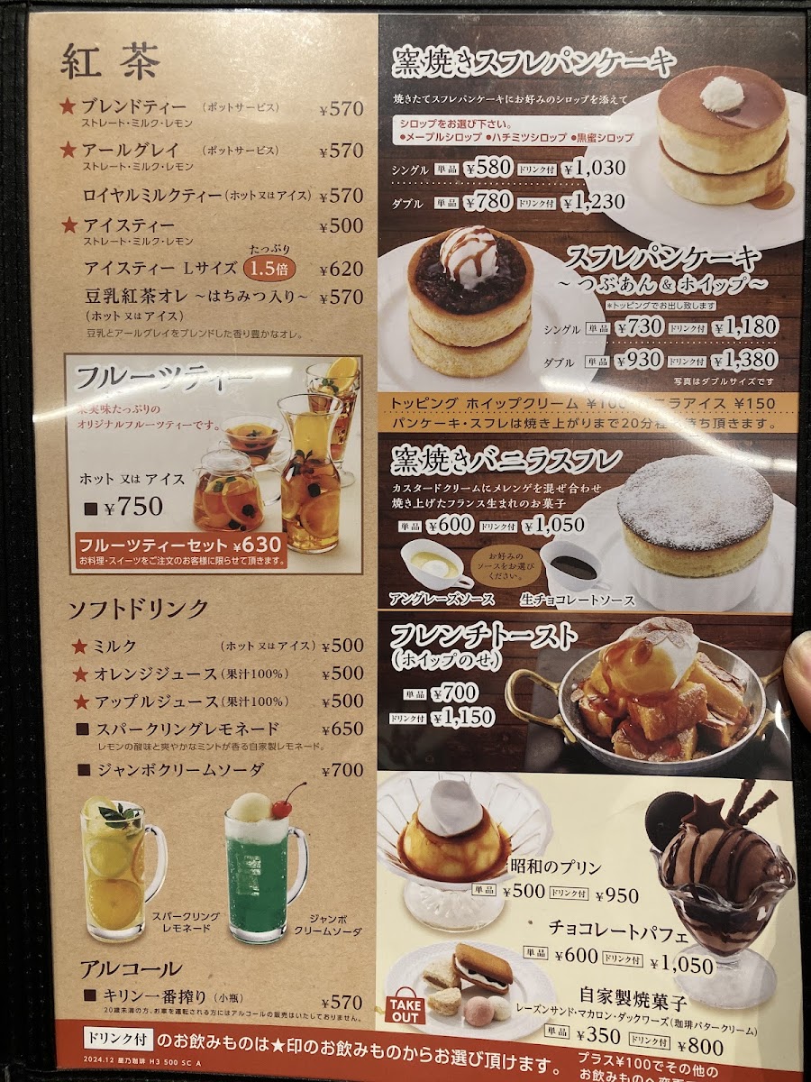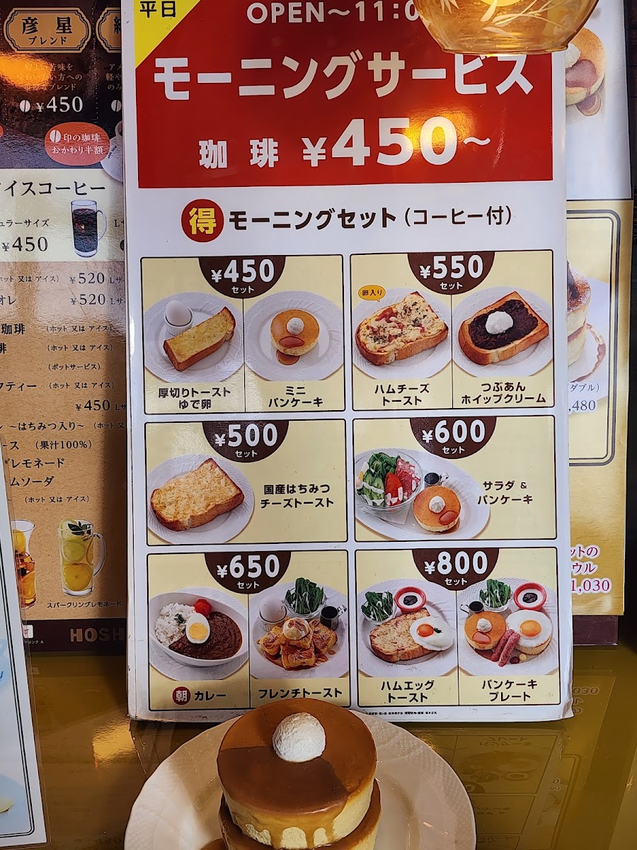 There are also excellent breakfast options, such as the パンケーキモーニング, which comes with fluffy pancakes served with a side of fruit, and the モーニングセット, which offers a range of breakfast favorites. For a bit of indulgence in the morning, the あんバタートースト is a delightful combination of sweet red bean paste and butter on toasted bread.